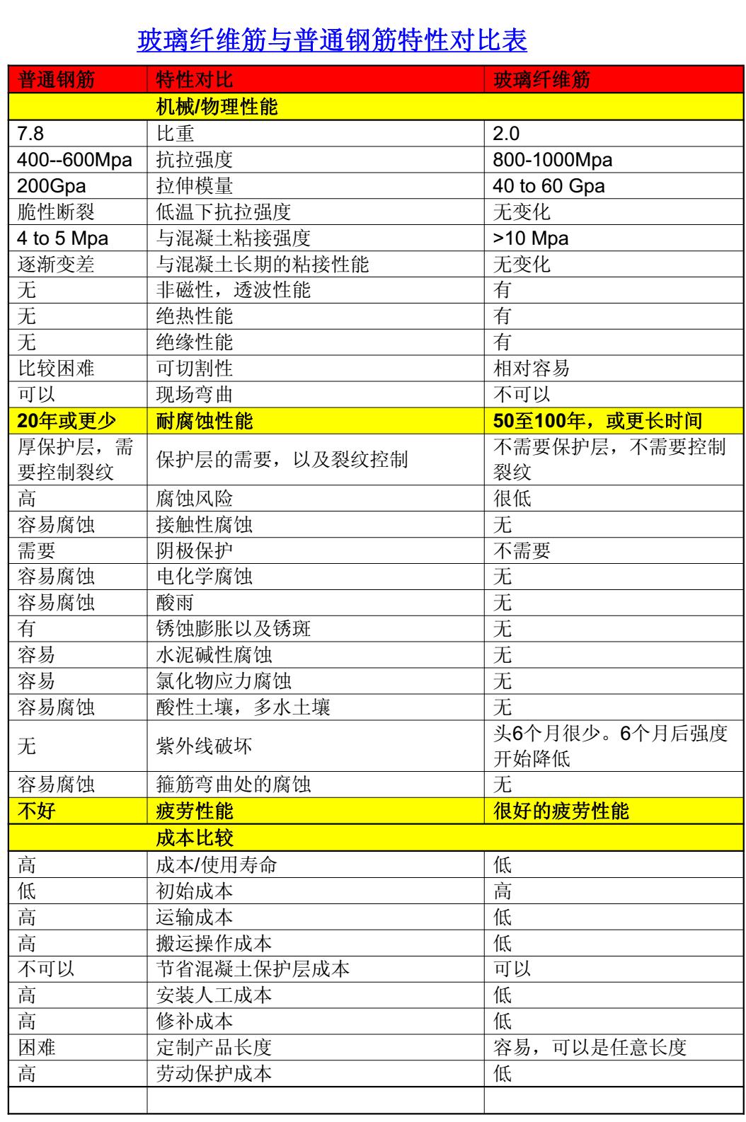 玻璃纤维筋与环氧涂层钢材相比的优点: