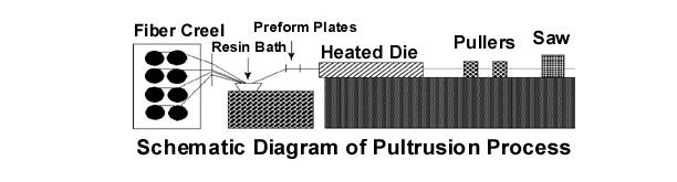 glass, carbon, aramid and other high performance fibers into a range of high performance resins, physical properties can be achieved to meet the needs of engineers in a wide variety of applications. Reinforcement fibers are drawn into a resin impregnation zone and then pulled through a preformer into a heated die. Here the shape of the end product is determined by the configuration of the die and the resin is polymerized.