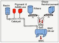 SMC is both a process and reinforced composite material. This is manufactured by dispersing long strands (usually >1”) of chopped fiber (commonly glass fibers or carbon fibers on a bath of resin (commonly polyester resin, vinylester resin or epoxy resin). The longer fibers in SMC result in better strength properties than standard bulk moulding compound (BMC) products. Typical applications include demanding electrical applications, corrosion resistant needs, structural components at low cost, automotive, and transit.