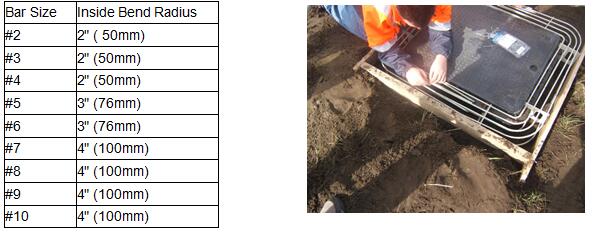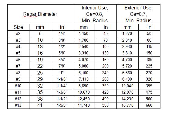 When the rebar is formed into big radius curves, a bending stress is resulted in the rebar. A radius smaller than those in the following table would exceed the long term sustained stresses allowable. The table gives the minimum allowable radius for induced bending stresses without any consideration for additional sustained structural loads.